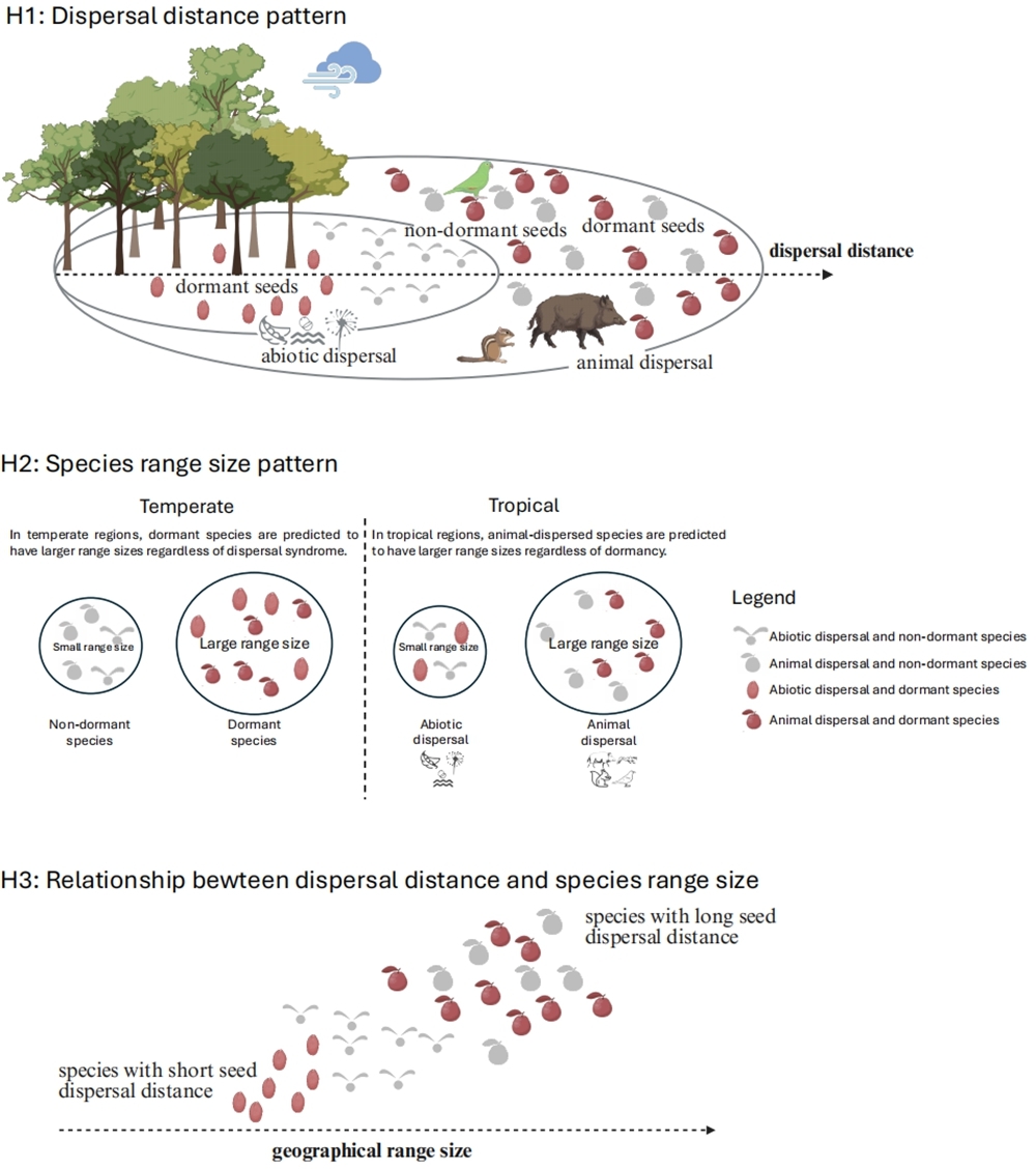 在自然生态系统中,种子扩散和休眠能力是影响植物种群维持与扩张的重要机制。然而,传播方式与种子休眠如何在不同气候区域中协同作用,并共同影响种子最大扩散距离及物种分布范围,仍缺乏系统认识。针对这一科学问题,中国科学院西双版纳热带植物园(以下简称“版纳植物园”)森林生态系统结构、功能与动态研究团队联合肯塔基大学和莱顿自然生物多样性中心的研究者,基于全球尺度,整合了全球631种种子植物(涵盖118个科)的相关数据,检验了种子最大扩散距离与休眠之间的权衡关系在由动物传播的种子与非动物传播的种子中的差异,探讨了气候因素在其中的调控作用,并分析了种子休眠与传播方式在热带与温带地区对物种分布范围的不同影响。